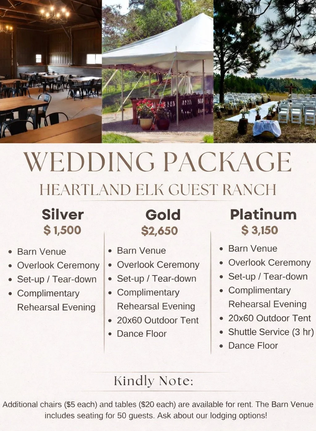 Barn Venue and Outdoor Ceremonies Host your wedding, reunion, or event at our Barn Venue! Heartland Elk Guest Ranch offers an unforgettable setting with stunning outdoor ceremony spots.